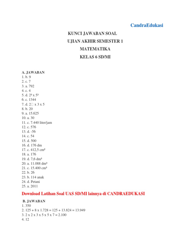 Soal dan jawaban berikut merupakan berikut ini adalah pembahasan soal dan jawaban latihan us, uas dan usbn untuk siswa kelas 6 sd pelajaran matematika semester genap dilansir kunci jawaban matematika kelas 6. Materi yang menjadi bahan evaluasi dalam soal matematika kelas 6 semester 1 ini diangkat dari buku revisi terbaru dan lembar kerja sisa (lks).